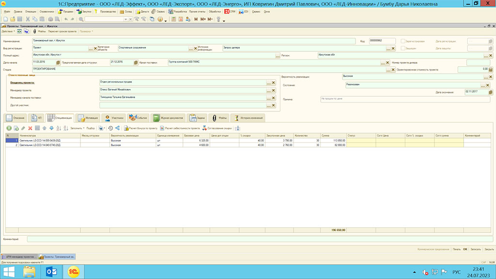 Проблемы внедренияПервоначально согласованием специальных цен под проект для Дилеров занимался только коммерческий директор. Его часто не было на рабочем месте из-за встреч с потенциальными клиентами. И даже если удавалось пересечься с директором для уточнения цен, приходилось запрашивать расчет себестоимости у смежных подразделений. В учетной программе существовали отчеты только по одной позиции или одному артикулу, а в проекте таких позиций могло быть от одного до нескольких десятков. Таким образом, для ответа на запрос требовалось потратить от 15 минут до нескольких часов. Это вызывало негодование как менеджеров, которым нужно было оперативно информировать Клиента, так и Дилеров, которые должны были выдать решение по ценам.