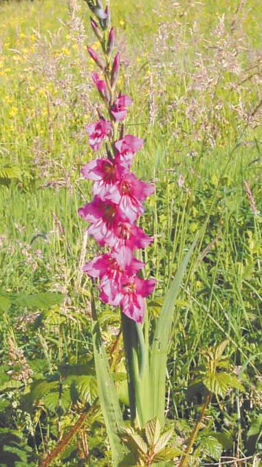 Гладиолус болотный – Gladioluspalustris Gaud. Родина – Беларусь, Центральная Европа, Северная и Центральная Италия, Балканы. Занесен в Красную Книгу России. Многолетнее клубнелуковичное растение с тонкими слабыми стеблями, 30-50 см высотой. Соцветие одностороннее. Цветки пурпурно-розовые, беловато-пурпурные, доли околоцветника овальные. Зимостойкий, цветет в июне-июле, плодоносит. Клубнелуковица до 2 см в диаметре.