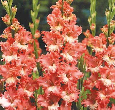 Гладиолус обыкновенный – Gladiolus communis. Происхождение – районы Средиземноморья, Малая Азия, Иран, Крым, Кавказ. Описан в 1596 г. Первый вид, известный в Европе. Многолетнее клубнелуковичное растение 30-60 см высотой. Соцветие плотное, одностороннее, до 18 см длиной, из 5-12 цветков диаметром 3-4 см. Окраска цветов – карминовая, светло-пурпурная, телесная или розово-красная. Зимостойкий, цветет в мае-июле, плодоносит.