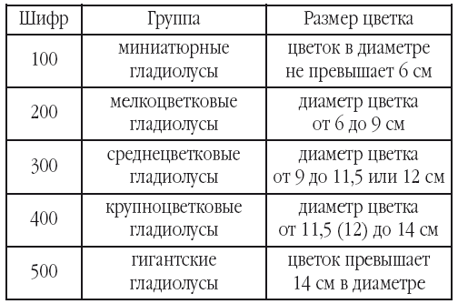 По величине цветка гладиолусы делятся на 5 групп, каждая из которых имеет свое цифровое обозначение. Иногда в различных источниках встречаются расхождения на полсантиметра в размере цветка.