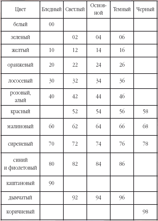 Шифр каждой окраски состоит из двузначной цифры. Первая обозначает класс окраски, к которому относится сорт, вторая – насыщенность цвета. Сокращенно вся цветовая шкала выглядит следующим образом: