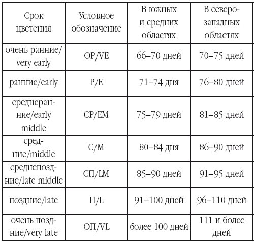 Классификация по срокам цветения. Последние буквы в записи сорта указывают на сроки цветения гладиолуса. Конечно, сроки эти весьма приблизительны, так как на юге и на севере гладиолусы развиваются по-разному. Различают очень ранние (ОР), ранние (Р), среднеранние (СР), средние (С), среднепоздние (СП), поздние (П) и очень поздние (ОП) сорта. Срок цветения определяется по времени зацветания луковицы I величины (3 см в диаметре), высаженной в открытый грунт. В таблице 1 приведены средние сроки цветения. Название сроков цветения (первый столбец) и их условные обозначения (второй столбец) написаны по-русски и по-английски (таблица 2).