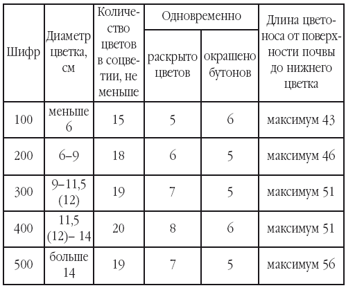 Например, соцветие сорта с шифром 400 (крупноцветковый гладиолус) должно состоять не меньше чем из 20 цветков, из которых одновременно должны быть открыты не меньше 8, а у следующих 6 бутонов должны быть окрашены лепестки. Длина цветоноса при этом должна быть не больше 51 см.