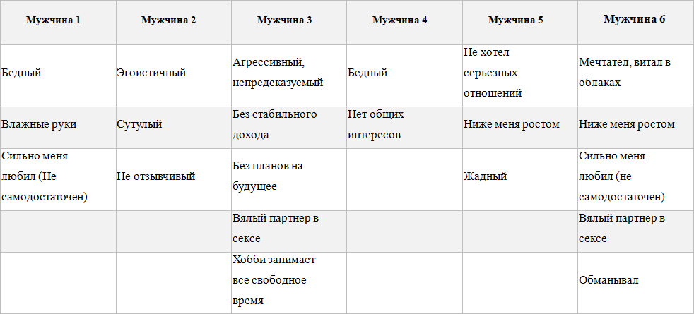 Взглянув на заполненную таблицу, с интересом для себя я обнаружила некую репетитивность (повторяемость) черт, т. е. я выбирала мужчин с «типичным» набором недостатков! А ты не сталкивалась с таким проявлением?
