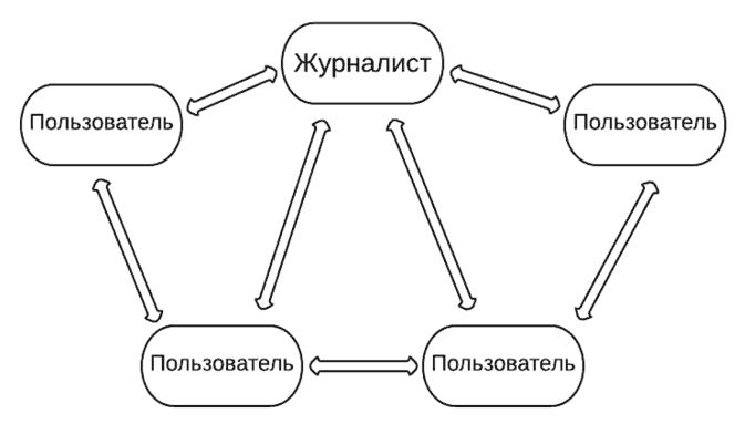 Между журналистом традиционных медиа и аудиторией выстраивается односторонняя, однонаправленная коммуникация (рис. 1). Для интернет-СМИ характерна двусторонняя интерактивная коммуникация, которая происходит не только между потребителем контента и журналистом, но и между разными группами аудитории (рис. 2).