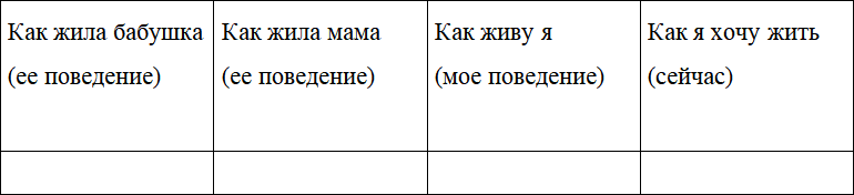 2) В 1, 2, 3 колонке укажите, что между вами общего. Например: бабушка пахала, мама пахала, я пашу. Таким образом вы обнаружите причинно-следственные связи, которые хоть и не оправдывают, зато объясняют, почему сейчас вы живете не так, как хотели бы.