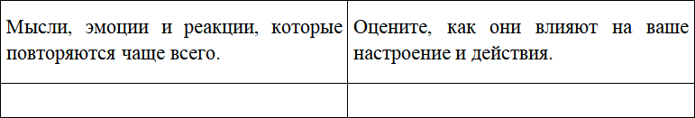 Практическое задание 6Заполняйте таблицу на протяжении одной-двух недель. Удерживайте высокую концентрацию на своем поведении, мыслях, поступках, реакциях.