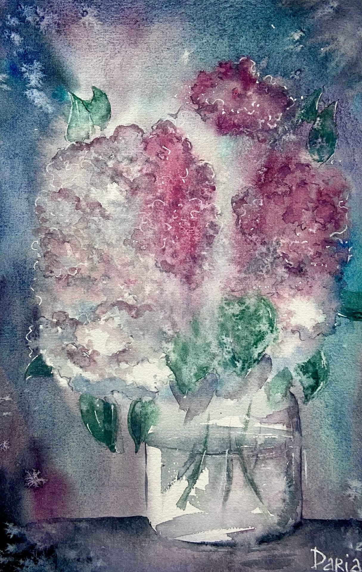 Огромный букет, его же не обхватишь руками! Скорее раскладывать краску на палитру, хочется буквально лепить цветом эти эмоции. Нельзя писать сирень и не быть влюбленным!