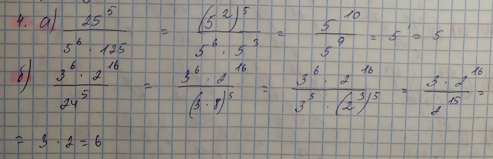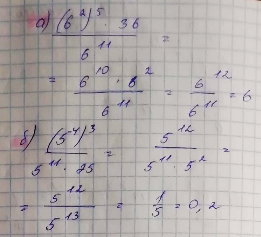 А) При таком положении скобок в числители степени перемножаем, число 36 представляем в виде числа в степени (6²), а затем в числители степени складываем, а далее вычитаем. Получается ответ 6 в первой степени.