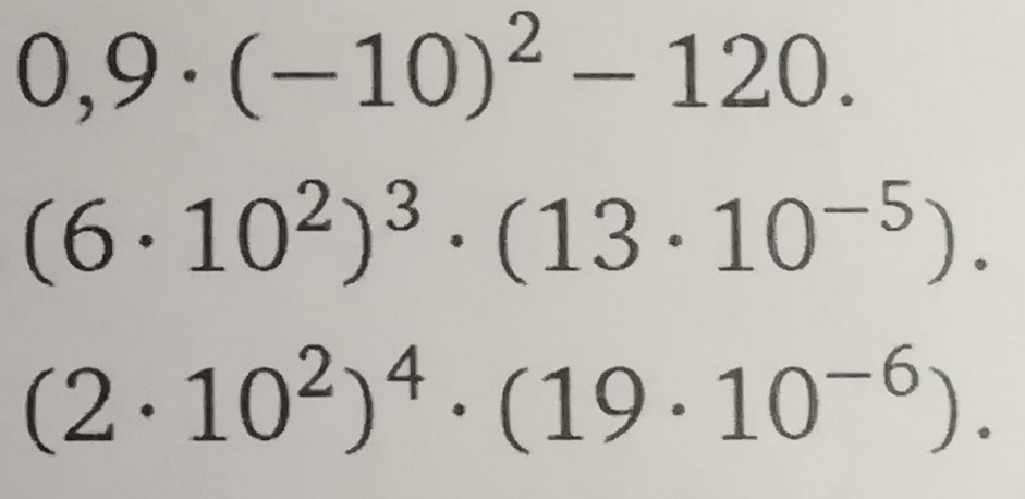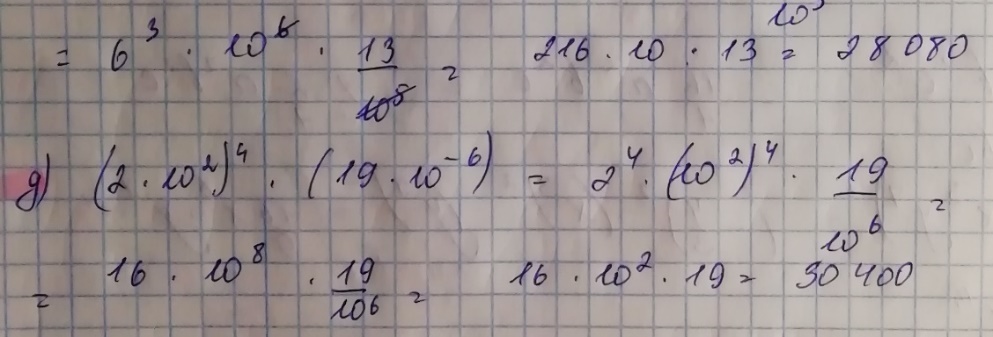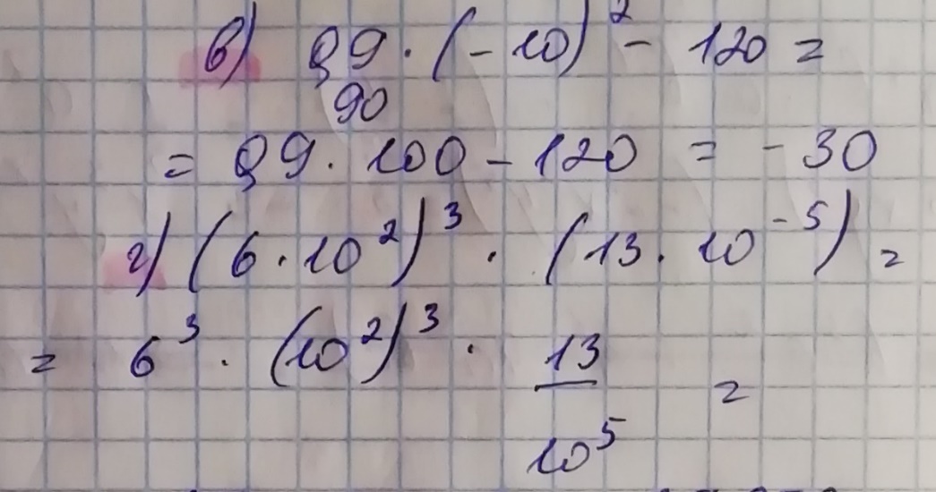 В) Сначала определимся со знаком, когда степень четная, то знак будет +, если нечетная, то (-). В данном случае степень четная, соответственно знак будет + при возведении в степень. (-10)² = 100. Далее 100 * 0,9, здесь не обязательно перемножать в столбик, достаточно посчитать сколько нулей у ста, а после запятую у числа 0,9 – перенести вправо на количество знаков, в данном случае – на два знака вперёд переносим запятую, получается 90. Далее вспоминаем как делать действия, если числа противоположные по знакам. 90-120, находим большее число и из большего вычитаем меньшее, ставя знак тот, который у большего числа. То есть 90 – 120 = (-30). У 120 знак минус, из него вычитаем 90 – получаем число 30 и знак ставим тот, который у числа 120.