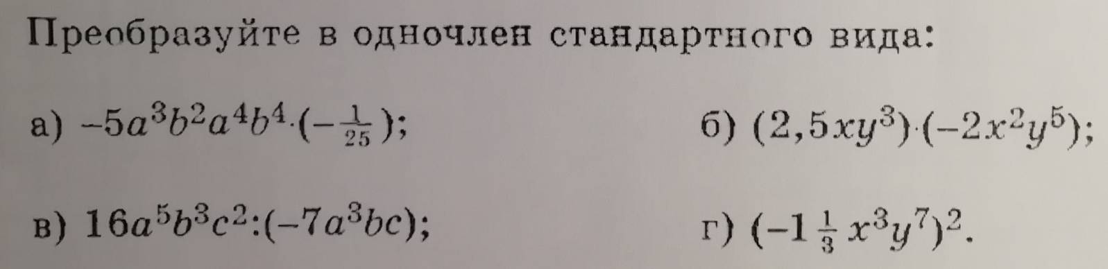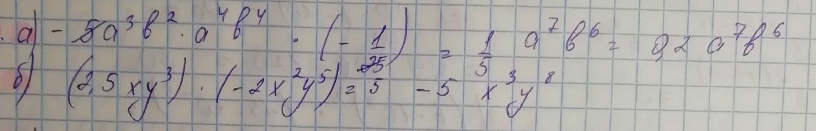 Б) Определив знак (-) * (+) = (-), можно после знака равно ставить знак минус. 2,5 умножаем на 2, получаем 5 целых. И складываем показатели степени одинаковых оснований.1