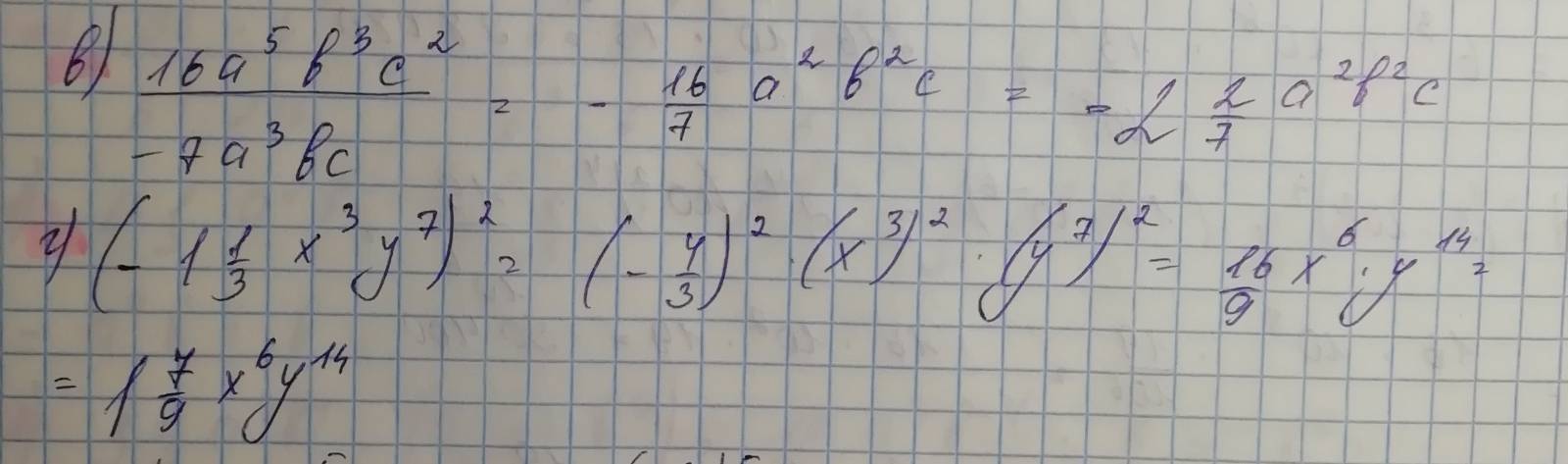 В) Определяем знак: (-) * (+) = (-), поэтому после знака равно ставим знак минус. Числа не сокращаются, поэтому можно оставить дробью. Так как есть черта дроби, то показатели степени с одинаковыми основаниями вычитаются. Если поделить 16 на 7 в столбик, то можно выяснить, что число нацело не делится, поэтому можно выделить целую часть. Если 16 разделить на 7, то можно взять по 2 целых (2*7=14). Если из 16 вычесть 14, то получится 2, соответственно получается данный ответ на рисунке.