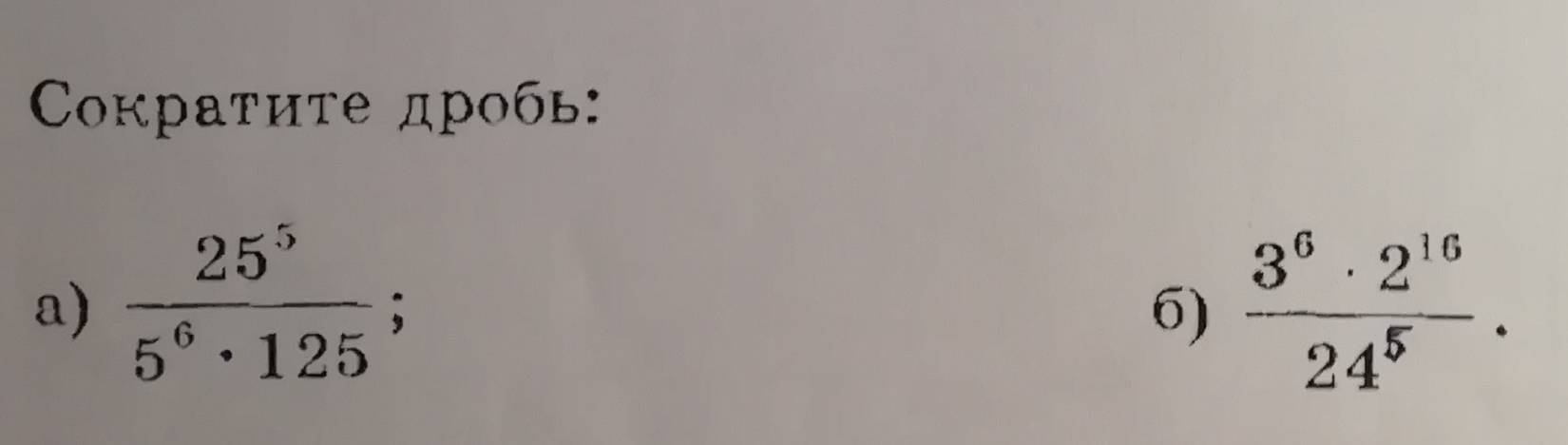Б) В этом примере следует разложить число 24 на множители (3*8), так как число 24 изначально в пятой степени, то и после раскрытия скобок получится, что каждое число будет в пятой степени. Число 8 можно привести к общему основанию, воспользовавшись таблицей степеней. Получается, что число 8 раскладывается, как 2³, а так как у нас степень ещё есть, то получится таким образом: (2³) ⁵. В таком положении степени перемножаются. И теперь можно сделать действия со степенями с одинаковыми основаниями.