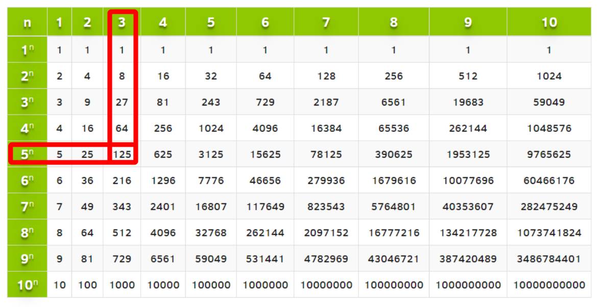 А) Сначала разложим число 25 на множители 5*5 = 5², и ещё в пятой степени. Далее видим число 125, чтобы выяснить какое число и в какой степени даёт его, то можно заглянуть в таблицу степеней. На этой таблице я пометила – какое число и в какой степени даёт 125. То есть это будет 5³.