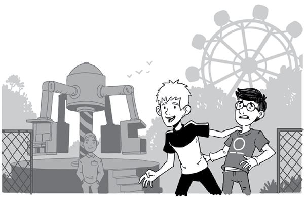 Роджер – дрон из видеоигры «МИР СУПЕРБОТОВ 3». После того как его засосало в реальный мир из-за компьютерного глюка, он помог мне спасти Эрика из когтей огроменного робота по имени Голиатрон. Если сейчас вы впервые слышите о Роджере, последняя фраза, пожалуй, покажется вам самой странной из всего, что вы читали когда-либо в жизни, но, обещаю, через некоторое время вы всё поймете. Так или иначе, Роджер в процессе спасения расшибся в пиксели, но папа нашего друга, мистер Грегори, собрал его обратно из запчастей. После этого Роджер сделался нашим неизменным компаньоном – вечно носится туда-сюда между моим и Эриковым домами, чтобы надолго не упускать из виду ни одного из нас. Мы прославились на весь квартал оттого, что держим дрона как домашнюю зверушку, и некоторые ребята тащились к нам с самых дальних улиц, чтобы посмотреть, как Роджер выполняет разные трюки. Вот как сейчас – раскачивается из стороны в сторону, издавая устрашающие звуки.