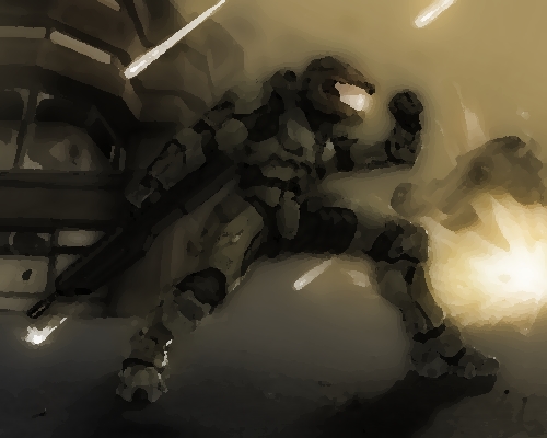 В этот момент одна из этих тварей, бесшумно спрыгивает с дерева и приземляется буквально в паре метров от меня. На голых инстинктах делаю подшаг и активирую клинок, резким ударом перечеркиваю эту тварь. Через миг по поверхности твари проходят волны, и она начинает проявляться, на меня смотрят глаза, через забрало боевого скафандра, в которых плещется неописуемая злоба, они начинают тухнуть и жизнь их покидает. На землю падает две половинки, которые раньше были человеком. Какого хрена здесь происходит!!! Дальнейшие события пронеслись красочным калейдоскопом перед моими глазами.