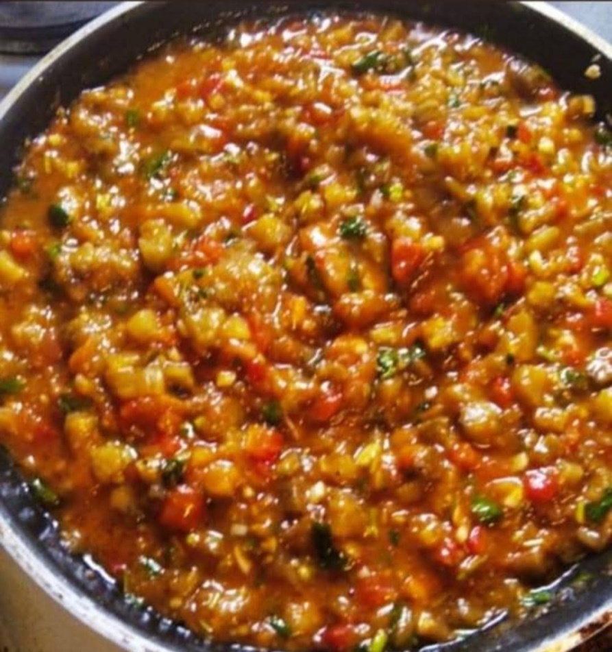 Потом всё нарезать, добавить соль, чёрный перец, зелёный лук, кинзу и другую любимую зелень.