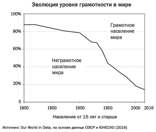 Радикальный проект по насаждению грамотности по всей Земле имел оглушительный успех. Конечно, неграмотность не исчезла, но теперь она – удел меньшинства. За несколько поколений человечество смогло осуществить глобальную программу когнитивного преобразования, которой нет равных в истории.