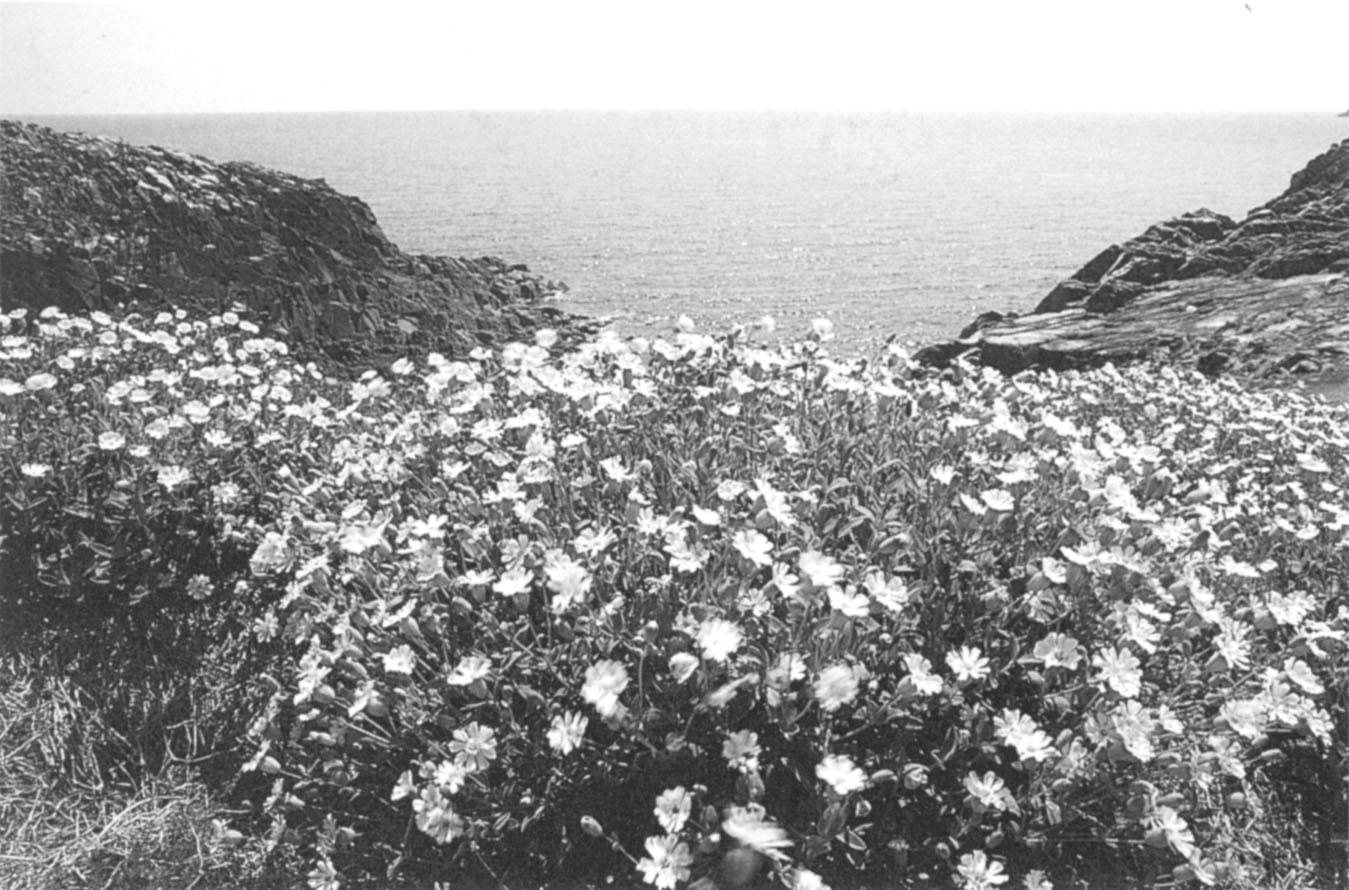 The Caha Mountains, made up of a great ridge of Old Red Sandstone, lie some 40 km southwest of Macgillycuddy’s Reeks. The northern side presides over the majestic Kenmare Bay while to the south they slope down to Ban try Bay. The Cork–Kerry border runs through the high ridge, Hungry Hill being the highest point at 685 m. The interest of Caha rests with a most exciting discovery, made in July 1964, of the small and delicate recurved sandwort found growing in narrow cracks of bare outcrops of Old Red Sandstone slabs east of Knockowen (658 m) and to the north-northeast of Cushnaficulla summit (594 m).24 About 1,000 plants were found at each of the locations. The Caha Mountains are the only known station in Ireland for this sandwort and it has never been recorded in Britain. The plant is a short and small tufted perennial with prostrate to semi-erect woody stems, forming a compact cushion of leaves. It is distinguished from the somewhat similar spring sandwort, also found on mountains (locally in Clare, Antrim, Derry and on the Aran Islands, Co. Galway) by having mostly down-curved leaves and 5–7 veins on the white sepals. Its white flowers, which seem large in relation to the overall plant size, bloom from June to August.