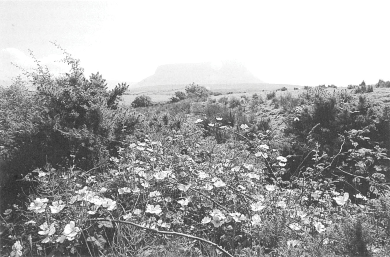 One curious feature of Benbulbin’s flat top, as previously mentioned, is its covering by a thick blanket of peat bog, with all the attendant peatland plants. Where the underlying limestone pokes up through the vegetable skin a calcicole flora develops including several alpine species. During the colonisation process several species of mosses, especially Breutelia chrysocoma, settle on the limestone pavement, thrive and proliferate, and they soon produce layers of humus which can then be colonised by the seeds of heather and other ericaceous species. The new arrivals draw most of their nutrients from the acidic moss humus rather than from the limestone below by ensuring that their roots grow initially upwards or horizontally.30 Gradually the bog builds up, becoming more and more acidic with time, and the plants then exist on whatever nutrients they can draw from their own mounting pile of peat humus plus those that fall out of the sky with the rain.