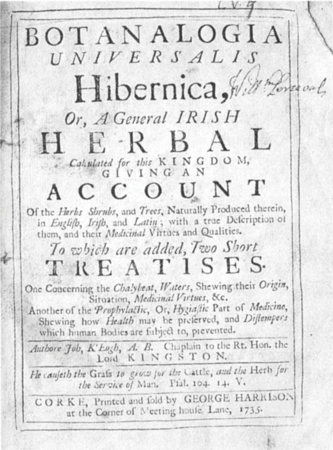 Following the appearance in 1525 of Bancks’ Herbal,45 the first printed herbal in English, named after the printer Richard Bancks, there was a succession of other herbals acting as vehicles for botanical information. But the herbalist’s era came to an end in 1735 when Linnaeus published Systema Naturae, the book that ushered in modern botany.46 The very same year, Ireland’s first herbal Botanalogia Universalis Hibernica by John K’Eogh (1681?–1754) was published in the city of Cork.47 Probably born in Co. Roscommon, K’Eogh was appointed Chaplain to James King, fourth Lord Kingston, and later obtained the living of Mitchelstown, Co. Cork. K’Eogh’s reason for writing the herbal was the daily viewing of his master’s gardens in which grew nearly 200 different species of herbs and trees. ‘I was not acquainted with any Garden, which could show so many, this was no small advantage, or Conveniency to forward this Undertaking.’ However, K’Eogh’s vision extended beyond the garden walls and comments on Irish localities and habitats of some of the listed plants are included in the herbal. A similar treatise followed in 1739 – Zoologia Medicinalis Hibernica – on the medicinal properties of animals.48 In his preface, K’Eogh stated ‘My principal intention in publishing these treatises on vegetables and animals, was to contrive to cure all the diseases, which the natives of kingdom are afflicted with, by simple, easy, and safe methods, prepared either by pulverisation, decoction, infusion, distillation, etc.’. The frequent eating of the brains of sparrows ‘excite venery and clear the sight’. Powered otter testicles drunk in a liquid ‘help to cure the Epilepsy’; the fat of a heron, mixed with oil of amber, ‘being dropt warm into the ears, cures deafness’. K’Eogh acknowledges his debit to Horace (65 BC–AD 8), Pliny (d. AD 79), Avicenna (980–1037) Albertus Magnus (c.1280) and others for the preparation of the listed prescriptions. Unfortunately no natural history information is included along with the animals listed in the Zoologia.