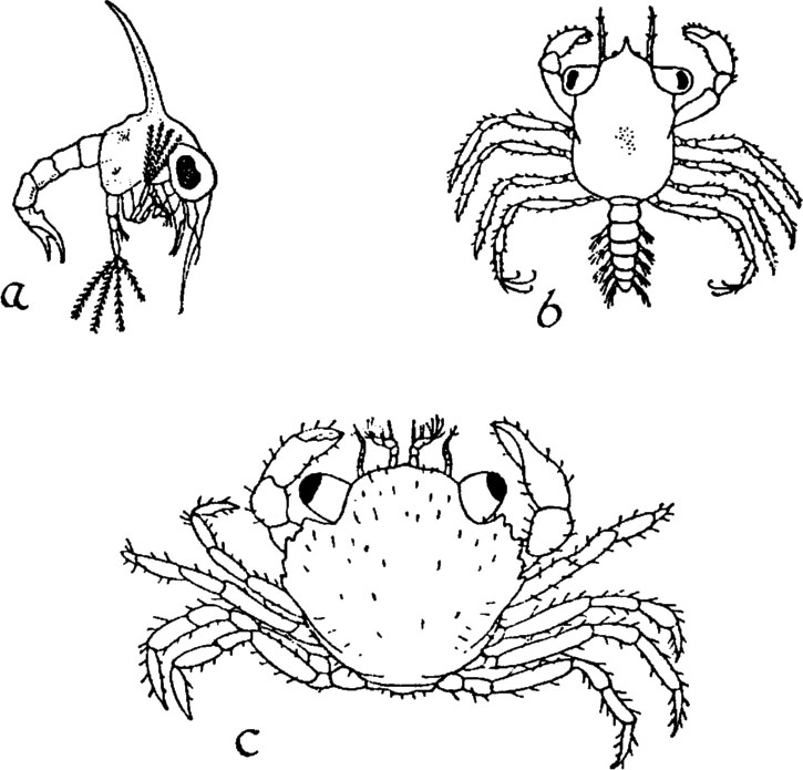 Stages (a-c) in the development of the shore crab. The discovery of the zoea larva (a) by zoologist John Thompson showed that the crab went thorough metamorphosis in its development from egg to adult, sharing this feature with the insects and uniting both as belonging to the Phylum Arthropoda. From C.M. Yonge (1961). The New Naturalist: The Sea Shore. Collins, London.