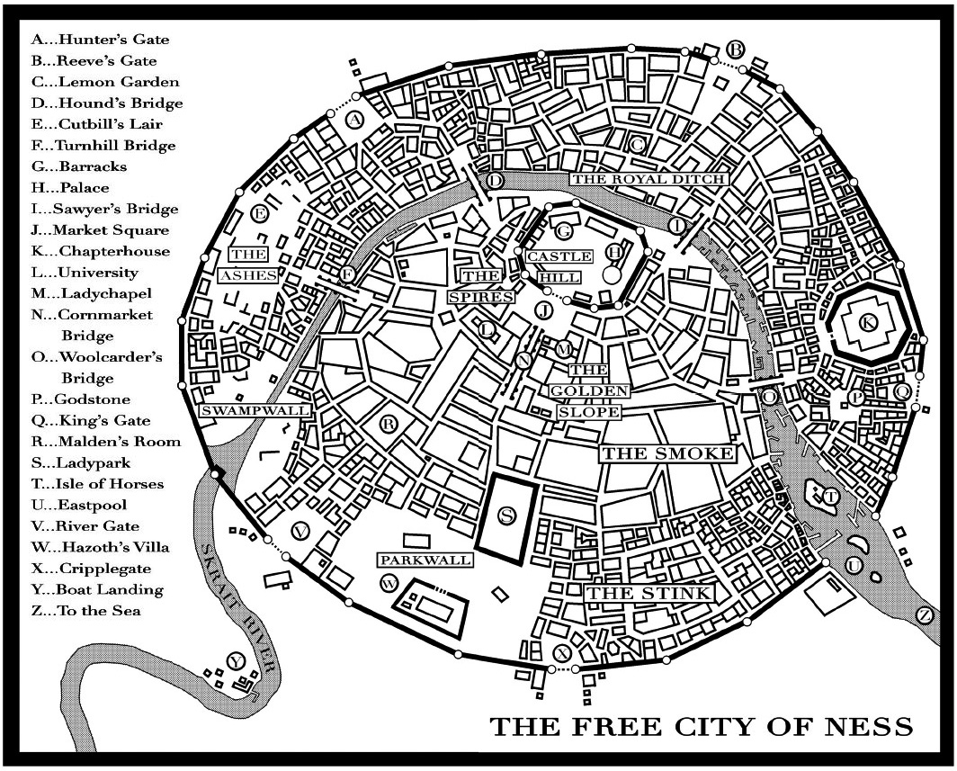 Day after day Lockjaw—and the rest of Ness’s thieves—waited for his return. No sign of him was found, nor any message received. Cutbill’s operation began to falter in his absence—thieves stopped paying their dues to the guild, citizens under Cutbill’s protection were suddenly vulnerable to theft, what coin did come in piled up uncounted and was spent on frivolous expenditures. Half of these excesses were committed in the belief that Cutbill, who had always run a tight ship, would be so offended he would have to come back just to put things in order.