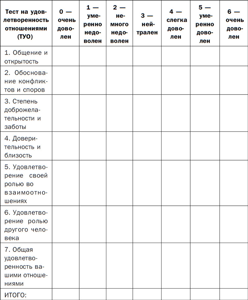 Тест на удовлетворенность отношениямиСогласно этому тесту вы должны ответить на вопрос, довольны ли вы отношениями в семи различных областях. ТУО можно провести менее чем за минуту. Ответив на все семь вопросов, сложите результат и запишите его в графу «Итого» внизу таблицы. Сумма может варьировать от 0 (если ответ «Очень недоволен» по каждому вопросу) до 42 (если ответ по всем вопросам «Очень доволен»). Оценочный лист показывает, как интерпретировать результат. Низкие баллы свидетельствуют о том, что вы несчастны с тем, кого тестировали, а высокие баллы показывают, что вы довольны своими отношениями. 39 баллов означают, что вы очень довольны, а цифра 42 говорит о том, что ваши отношения феноменально хороши.