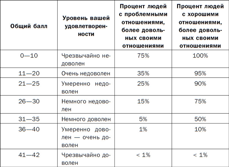 Глядя на оценочную шкалу, вы можете сравнить свои результаты с результатами других людей с успешными или неуспешными отношениями. Например, если ваш балл 5, то это означает, что вы чрезвычайно недовольны своим браком. Оценочная шкала показывает, что 100 % людей в успешном браке оценили свои отношения гораздо выше. Кроме того, 75 % людей с проблемными взаимоотношениями также оценили себя намного выше. Это означает, что вы менее довольны, чем большинство из них. Хотя низкие оценки заслуживают внимания, это вовсе не означает, что ваши отношения действительно проблемны или что вы и ваш партнер совершенно не подходите друг другу. Это всего лишь показатель того, что вы очень несчастны и что ваши отношения не соответствуют вашим нуждам.