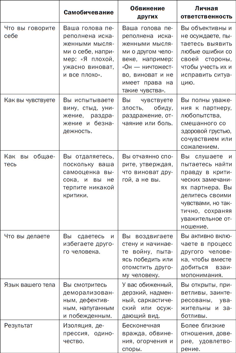 Самобичевание вовсе не противоядие от привычки обвинять других. Как видите из таблицы на странице 74, самобичевание ведет к чувству вины, тревоге, депрессии и отчаянию. Оно не поможет полюбить или решить проблемы в отношениях с другими людьми. Личная ответственность при отсутствии склонности к обвинению – это тот склад ума, который ведет к близости.