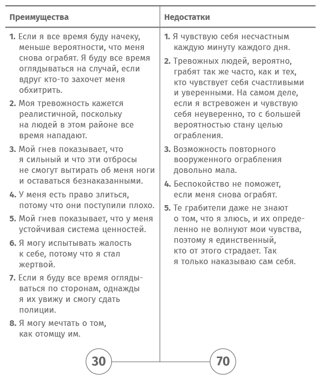 Затем я спросил Сэма, может ли он перечислить какие-то недостатки постоянного чувства тревоги. Какова цена, которую ему приходилось платить за это чувство? Как вы видите по анализу преимуществ и недостатков, Сэм перечислил несколько довольно серьезных недостатков, например тот факт, что он чувствовал себя несчастным каждую минуту каждого дня. Он также подверг сомнению идею, что тревога защитит его от опасности или поможет ему действовать более эффективно в маловероятном случае повторного ограбления.