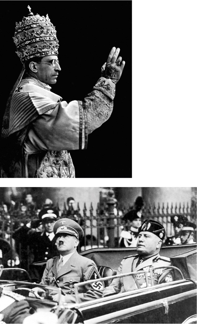 Вверху – Пий XII благословляет паству после своей коронации, Рим, площадь Святого Петра, март 1939 г. (Legion Media); внизу – Гитлер и Муссолини, Рим, май 1938 г. (Getty Images).