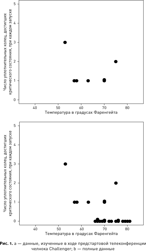 Ситуация проиллюстрирована ниже на двух диаграммах. На рис. 1, а показана диаграмма, которая обсуждалась на телеконференции. Это график зависимости количества поврежденных уплотнительных колец при каждом запуске от температуры в градусах Фаренгейта. Так, при 53 ºF – самой низкой температуре воздуха при запусках в прошлом – три уплотнительных кольца достигали критического состояния, а при 75 ºF, что было самой высокой температурой, при которой осуществлялся запуск, критического состояния достигли два уплотнительных кольца. Мы видим, что нет устойчивой связи между температурой при запуске и числом поврежденных уплотнительных колец.