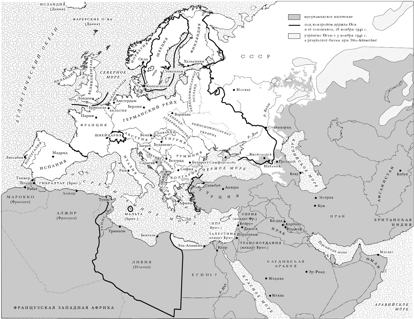 ВТОРАЯ МИРОВАЯ ВОЙНА затронула значительную часть исламского мира. Около 150 миллионов мусульман от Северной Африки до Юго-Восточной Азии жили под британским и французским владычеством, а более чем 20 миллионами управлял Советский Союз. В разгар войны, когда Япония вторглась на мусульманские земли в Юго-Восточной Азии, а немецкие войска захватывали территории на Балканах, в Северной Африке, в Крыму и на Кавказе и приближались к Ближнему Востоку и Средней Азии, державы Оси, как и их противники, в полной мере оценили политическую и стратегическую важность ислама.