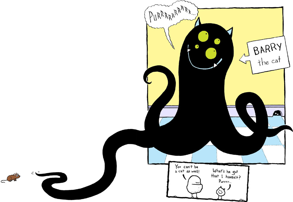 “Don’t mind the cat,” said Fuzzby as a wriggling black blob with tentacles and four eyes slithered out from behind Joe. “Barry is very friendly. Usually.”