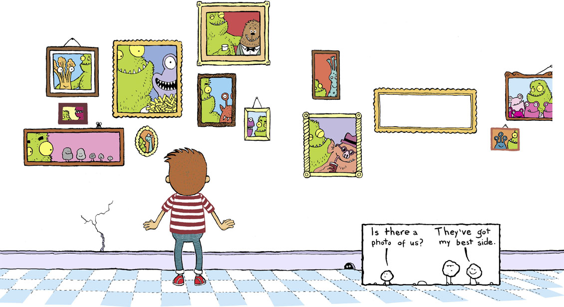 “Now for some questions,” said Fuzzby, pointing towards a chair. Joe sat down and the big green monster sat in front of him with an official-looking clipboard. “Firstly,” said the monster, “what is your name?”