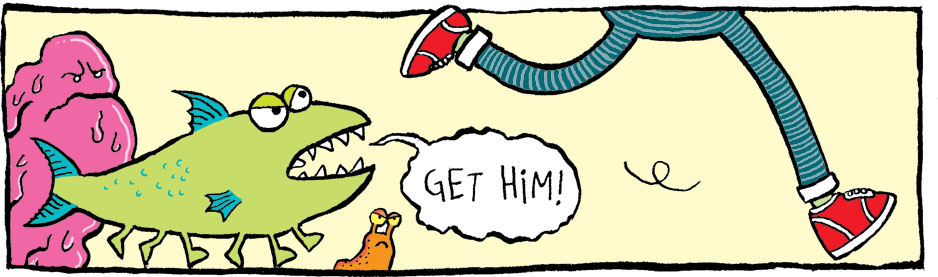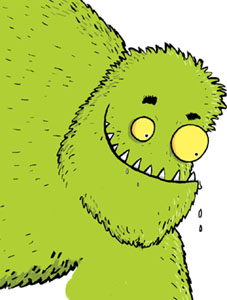 With a yelp, Fuzzby immediately leapt up on to a table. Barry sprang after him, a look of terror in all four of his eyes. He perched trembling on top of the bigger monster’s head.