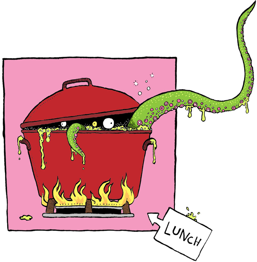 In the kitchen behind Fuzzby, large pots bubbled and burped with purple ooze, or had brown slime dripping down their sides. A saucepan lid rose as a tentacle gingerly reached out from inside, but it shut with a clank after a quick rap from Fuzzby’s ladle.
