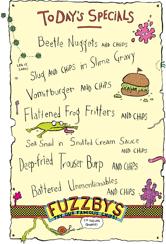 “You’ve got the job, Joe – if you want it!” said Fuzzby, climbing down from the table, peeling Barry off his head and giving Joe a handshake that lifted the boy off the floor. “We’ll ignore your almost total lack of any cooking knowledge or qualifications whatsoever. If you can handle terrifying and hideous creatures with bravery like that, then you can handle anything!”