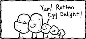 Barry sneered, “He’s not so clever. How about this one: how do you get the little bubbles inside Rotten Egg Delight?”