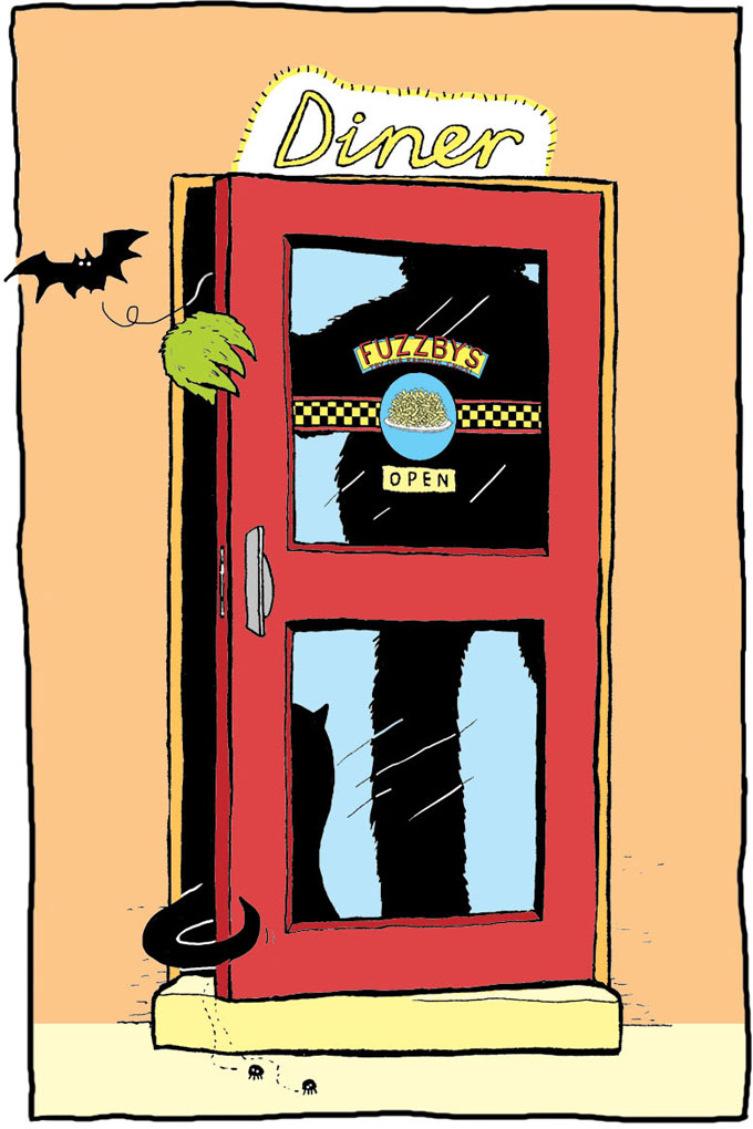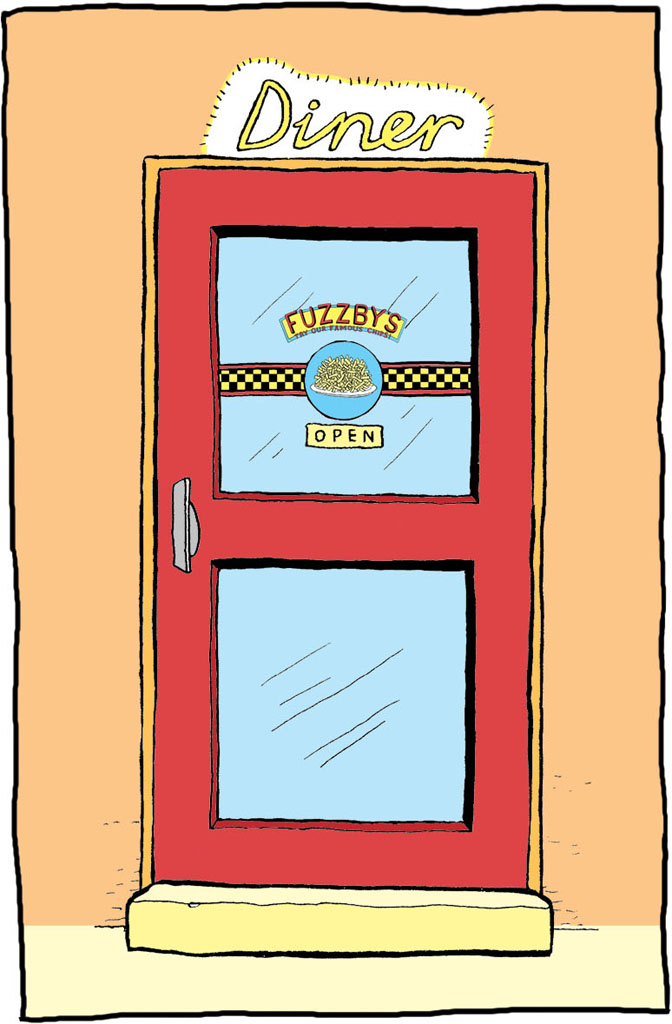 Then he noticed a door he hadn’t seen before, even though he must have gone past it. On the door was a sign that said: FUZZBY’S DINER. Underneath that it said: TRY OUR FAMOUS CHIPS!
