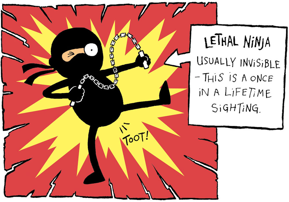 “The advantage of being a bum-toot,” said Joe, summoning Joe the Fearless once more, “is that they are both lethal and invisible. Like ninjas. So I’m quite proud to say that I am a squirming little bum-toot. In fact, I thank you for the compliment.”