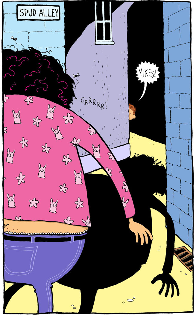 But – disaster! Grotty Grace had followed him, sniffing about like a hungry wolf after a rabbit. “I know you’re down there, bum-toot!” he heard her bellow. There was no escape – the alley ended in a high wall. The heavy footsteps of doom grew louder. Grace wasn’t giving up. Joe was in a panic – what could he do?