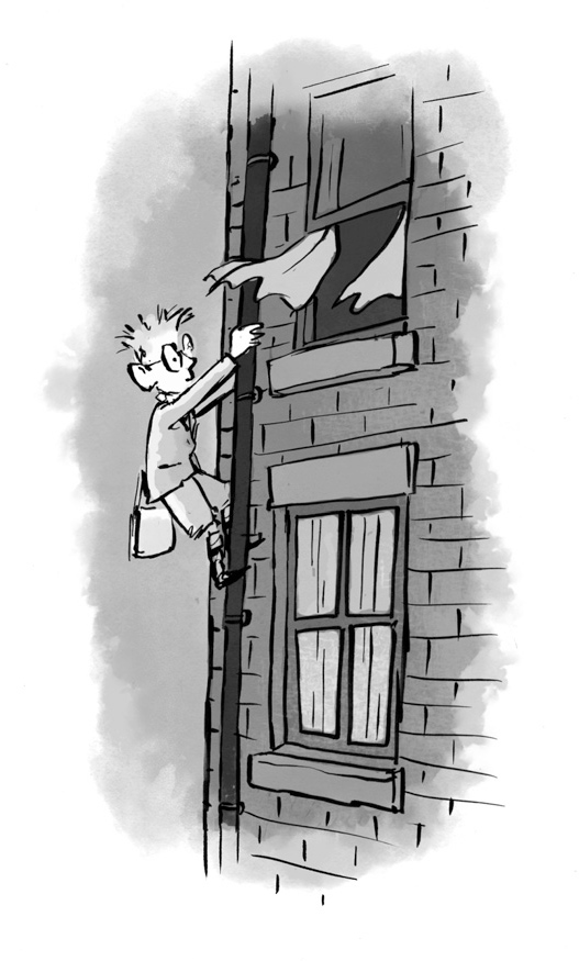 Next, remembering exactly how Gertrude slid down her rope, he shimmied down the drainpipe. Then Eric ran off through the dark and empty streets of London.