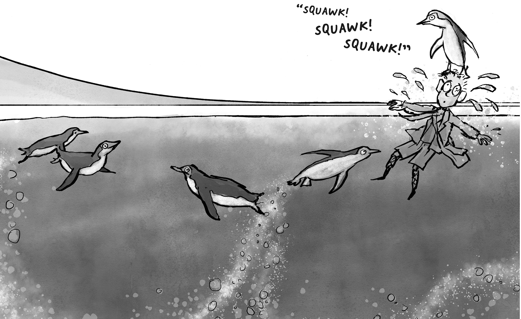 The boy had plunged into the penguin pool!