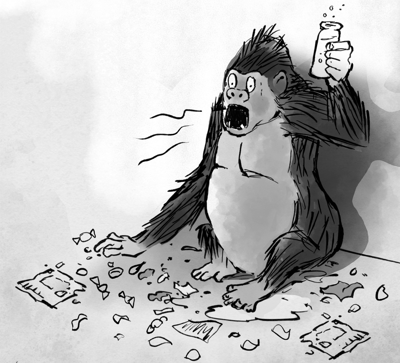 The pair tiptoed over to the window. Sure enough, there was the gorilla, slumped on the floor amid a massive mess of food. There were bags and wrappers everywhere. Gertrude was alternating between swigging from a bottle of fizzy pop and munching on some jelly babies that had been scattered all over the floor.