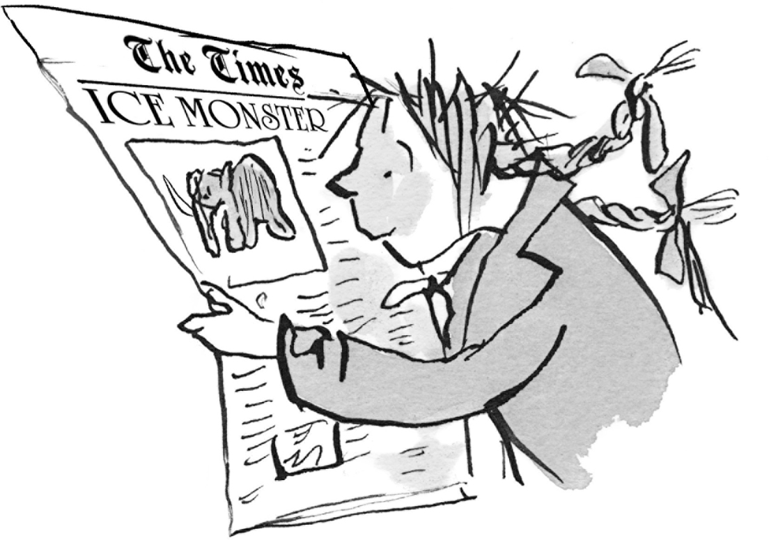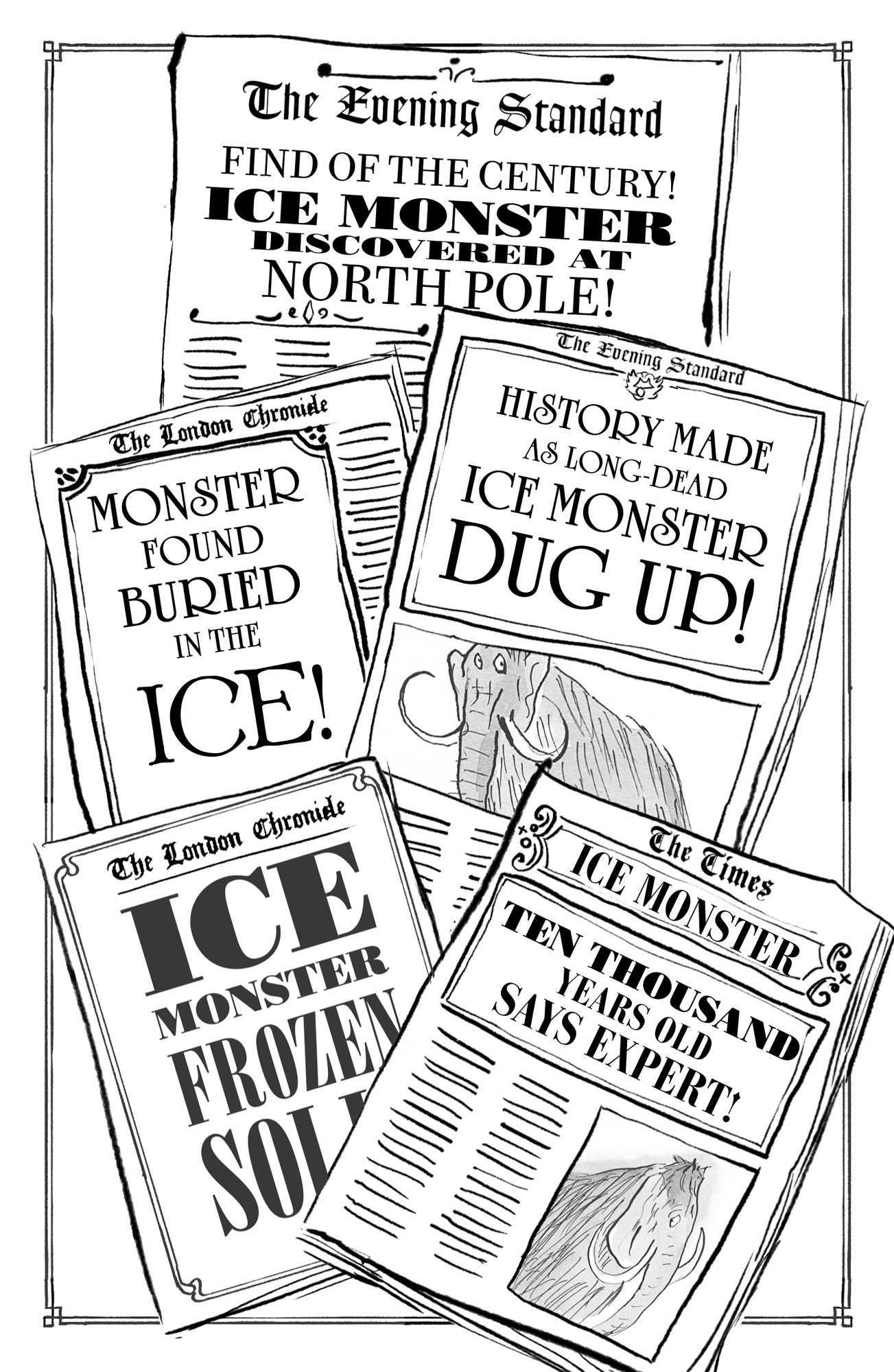 Elsie was desperate to follow the story of the Ice Monster. So every morning she swiped another newspaper to search for news of the creature. Weeks passed, and then one day she spotted a jumble of letters she recognised on the front page of a newspaper.