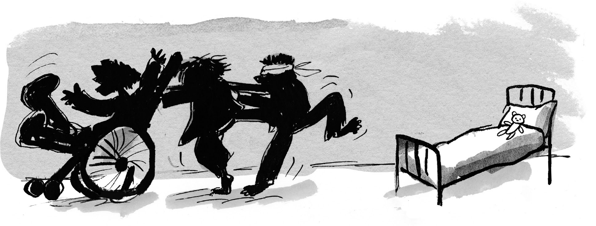 Soon it was clear that it wasn’t just George who was out of his bed. Robin was also there, pushing Amber along in a wheelchair. The wheelchair was old and rusty, and even had a flat tyre. Because Robin had bandages over his eyes, he couldn’t see a thing. Amber’s bandaged legs banged straight into the wall.