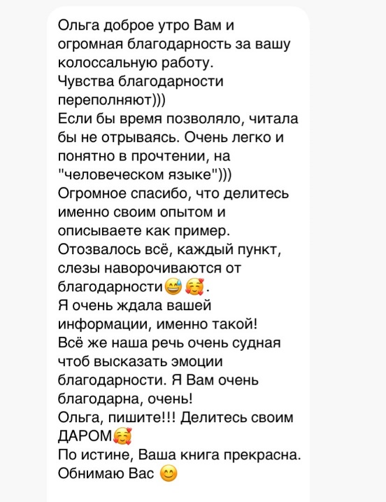 Села я за книгу 19 января 2023 года. Поначалу все шло гладко. Я просто садилась за ноутбук и пальцы сами набирали текст. Затем наступали моменты тишины. Я садилась за ноут, но внутри не было ни-че-го. В итоге за 9 месяцев моя рукопись была готова. Я испытывала такое благоговение, такой восторг, который невозможно описать словами. Я летала. Я испытывала счастье. Под воздействием этих чувств, уверенная в успех книги, осенью 2023 года я отправила рукопись в два издательства… и получила отказ. Я плакала несколько дней и ночей. Я проживала целый коктейль эмоций от злости до бессилия. Я не понимала, почему так произошло. Меня ж Высшие силы благословили на эту книгу, я же чувствовала важность и глубину своей книги. Почему отказ??? Что пошло не так? Пару месяцев я позволила себе побыть в том состоянии, прожить появляющиеся эмоции и уже из нового спокойного состояния в январе 2024 года села писать новый вариант книги. Появилась даже благодарность к издательствам, которые мне отказали, потому что мои знания и наблюдения более структурировались и я была готова все изложить заново. Имея основу в виде первой рукописи, вторая рукопись была готова уже в мае 2024 года. Этой же весной я закончила школу гипноза и познакомилась со своим Наставником и Высшим Я. Это прям отдельная тема, о которой расскажу позже. На тот момент у меня снова возник вопрос: «Что делать с новой книгой? Писать в издательства? Издавать самостоятельно? Отдать людям в том виде, который есть?» Ответ получила от своего Высшего Я на сеансе гипноза. Он мне четко сказал: «Отдай людям. Прям как есть. Тебя книга душит и выматывает. Делись ею». И я последовала совету. Я просто так начала отдавать людям ссылку на книгу в электронном варианте. Запросов было немного, так как мою теорию Триединства не совсем еще понимали, она очень сильно «расходилась» с традиционной психологией. Я терпеливо записывала видео, в которых рассказывала о насущных проблемах и делала акцент на свою книгу. Без ожиданий и без напряжения. Все это я уже к тому моменту прожила. И 23 сентября 2024 года моя книга «выстрелила». Утром я проснулась знаменитой. Когда я открыла свой аккаунт в соцсети, я сначала не поняла, что происходит. Более 2000 подписок за сутки и более тысячи запросов на книгу. И снова целый спектр эмоций поглотил меня. Я и плакала, и прыгала от счастья. Я благодарила Бога, всю Вселенную и каждого человека, который проявил интерес к моей книге. Я с радостью отправляла книгу каждому, кто делал запрос и взамен лишь просила обратную связь после прочтения. И дальше я стала получать отзывы о моей книге. Некоторые из них я хочу опубликовать здесь, уже в третьем новом варианте, в том виде, как они приходили мне.