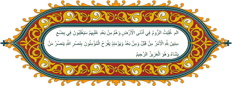 «Алиф. Лам. Мим. Повержены римляне в самой низкой[16] земле. Но после своего поражения они одержат верх через несколько лет. Аллах принимал решения до этого и будет принимать их после этого. В тот день верующие возрадуются помощи Аллаха. Он помогает, кому пожелает. Он – Могущественный, Милосердный»[17].